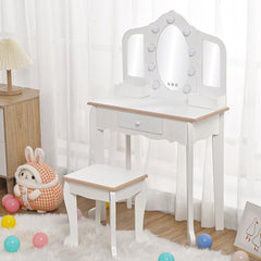 Garvee Princess Vanity Set for Toddlers - Kids Vanity with 3 Mirror & Light, and Stool, White