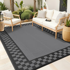 Garvee Waterproof Plastic Straw Outdoor Rug 9x12 Grey, Checkered Reversible UV Resistant Foldable Mat for Patio, Deck, Picnic, Beach